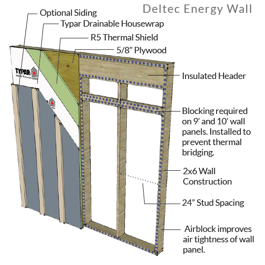Their design used a 2-story 1200 square foot round model on a slab foundation, plus a 2-story wing for stairs, and a single-story wing for an attached garage. As part of a strategy for superior insulation levels in our mixed-humid climate, they chose our “Deltec Energy Wall,” an upgraded perimeter wall option. This open-stud wall system, assembled in our factory, uses 2×6 stud framing (compared to the industry standard in North Carolina, which is still just 2×4) for greater strength and thicker cavity insulation values. It adds to that an exterior layer of continuous foam insulation, a useful strategy for wrapping the entire house in an extra blanket of insulation and reducing what energy nerds call “thermal bridging”: that is, the tendency for heat to escape more quickly through areas of lower insulation value (such as the wood studs). The structural headers of the Deltec Energy Wall are insulated in our factory with recycled scrap foam material, and our craftsmen apply a gasket at the perimeter of the plywood sheathing to seal it to the wall, increasing the home’s total air-tightness. The home captures views using windows from Marvin Essential collection, also installed in our factory.
